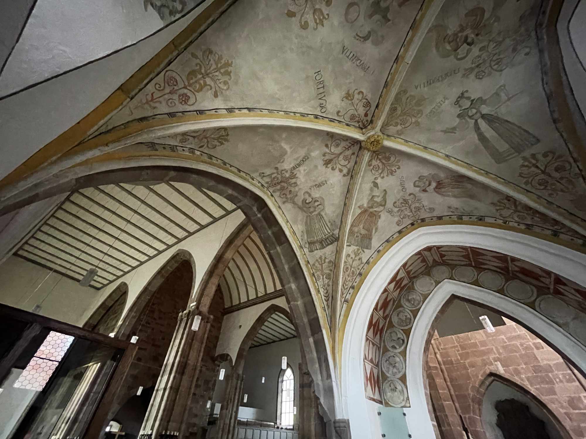 In der Taufkapelle im Ostteil des südlichen Seitenschiffes befinden sich Wand – und Deckenmalereien, die bei Bauarbeiten 1934 freigelegt wurden. Es sind sechs Frauengestalten zu sehen. Sie versinnbildlichen die Tugenden und tragen bekannte Attribute, z.B. Justitia mit Schwert und Waage.