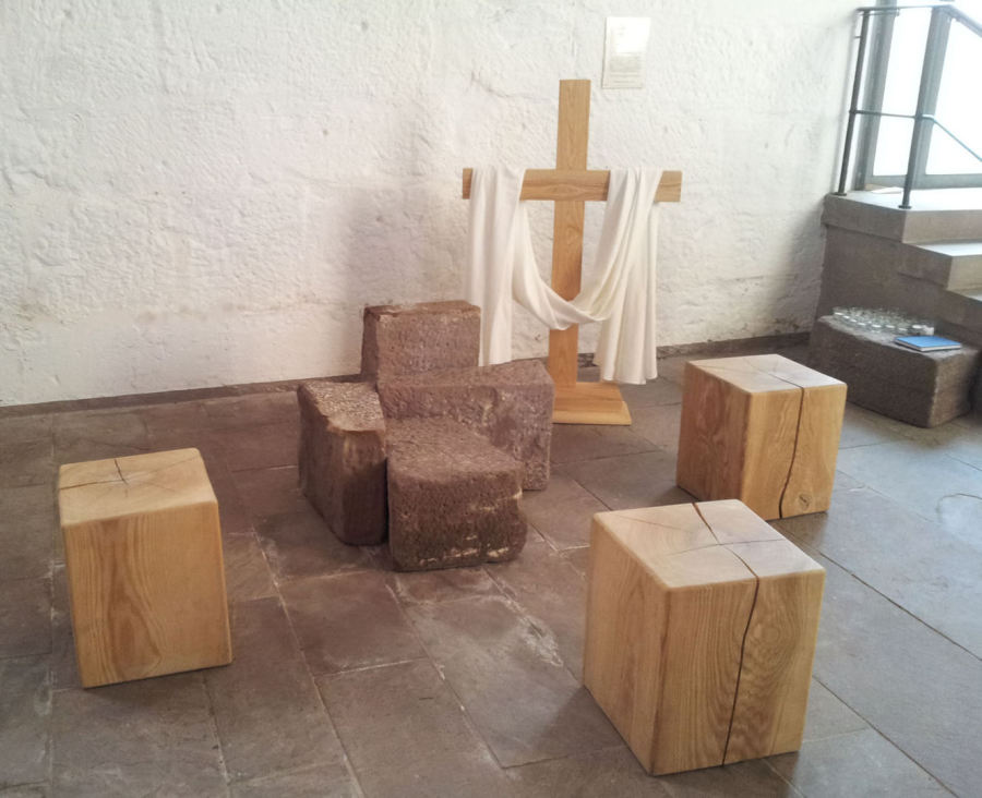 Wie zu einem Kreuz haben sie sich fast selbst zusammengefügt: die Steine der alten Bohlenbrücke, die Ende des 19.Jahrhunderts auch bei Hochwasser den Zugang zum Witzenhäuser Nord-Bahnhof ermöglicht hatte. Seit langem funktionslos, formieren sie sich nun nach den Vorstellungen des Gestaltungsausschusses zum Zentrum einer Gebetstecke, die in der Liebfrauenkirche zum Beten einlädt. Kleine Kerzen auf der Ablage oder Eintragungen in einem Fürbittenbuch neben dem Steinarrangement können für Reisende und Rastende zum Ausdruck und Zeichen des Gebetes werden.